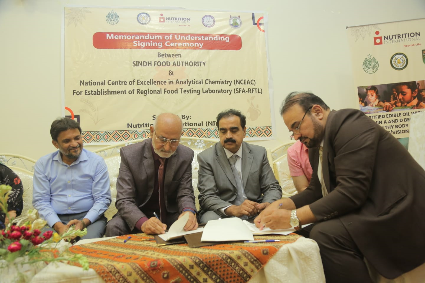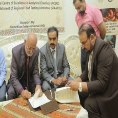 MoU Signing Ceremony between SFA and NCEAC, University of Sindh, Jamshoro MoU was signed between the Sindh Food Authority through its Director General (Mr. Agha Fakhar Hussain) and the National Center of Excellence in Analytical Center through its Director (Prof. Dr. Syed Tufail Hussain Shah) for the establishment of Regional Food Testing Laboratory with the support of Nutrition International during a provincial workshop on edible oil fortification at Indus Hotel Hyderabad on 7th June 2023. The main purpose of this MoU is to establish well equipped and advanced Food Testing Laboratory to provide safe and healthy food to the region. Furthermore, the graduate students will be given internships at Sindh Food Authority for gaining first-hand experience and develop practical experience and further technical skills to excel in the future. Prof. Dr. Syed Tufail Hussain Shah, Prof. Dr. Najma Memon and Dr. Sarfaraz Ahmed Mahesar also participated in the Provincial Workshop on Edible Oil Fortification at Indus Hotel Hyderabad on 7th June 2023.